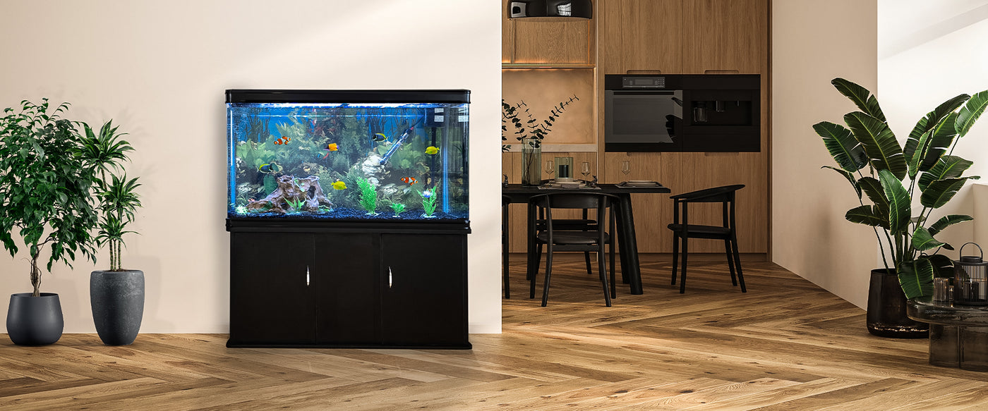 Eleve o ambiente da sua casa com a nossa sofisticada combinação de aquário e armário. Este kit inicial completo fornece tudo o que é necessário para criar um aquário próspero.