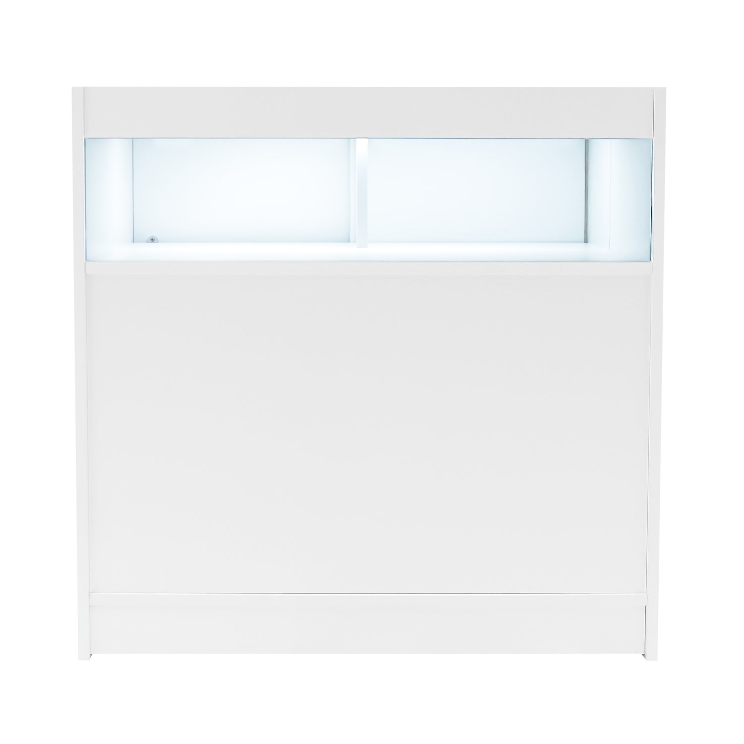 Todos os balcões são fabricados em MDF de alta qualidade com acabamento em melamina branca resistente, garantindo durabilidade e uma aparência moderna e uniforme. Esse acabamento compartilhado cria uma estética coesa em todo o conjunto, enquanto os painéis de vidro temperado do B900 adicionam um toque refinado às áreas de exposição mais destacadas.