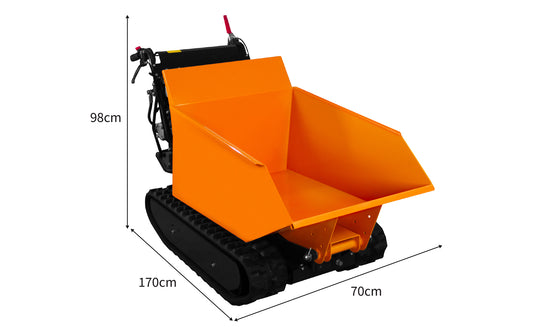Carregue até 500 kg na caixa de carga suficiente de 100cm de comprimento x 70cm de largura x 45cm de altura. Para aumentar a capacidade do contentor, incluímos uma prática caixa de extensão que se conecta simplesmente ao seu contentor com 4 clipes de fixação para fornecer espaço de carga adicional para o transporte de materiais. Apesar da sua impressionante capacidade, o mini dumper beneficia de um design compacto que o torna adequado para utilização em áreas inacessíveis a má quinas maiores. Ao chegar ao seu destino, a carga pode ser rapidamente descartada usando a alavanca de inclinação que é acionada por uma bomba hidrá ulica para uma inclinação eficaz com o mínimo de esforço.