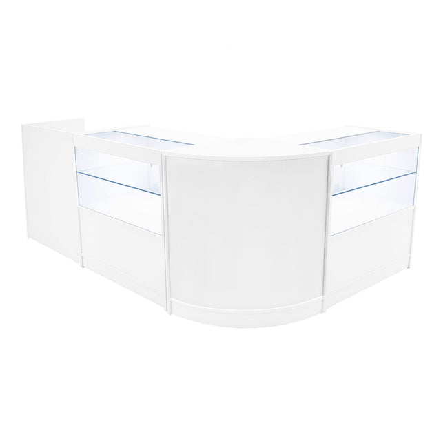 Cria uma exposição comercial refinada e profissional com este exclusivo conjunto de balcões premium, que inclui dois balcões com vitrina LED C900, um balcão de canto curvo CM60 e um balcão de caixa TB60 – a combinação perfeita de estilo, funcionalidade e flexibilidade para qualquer ambiente comercial moderno.