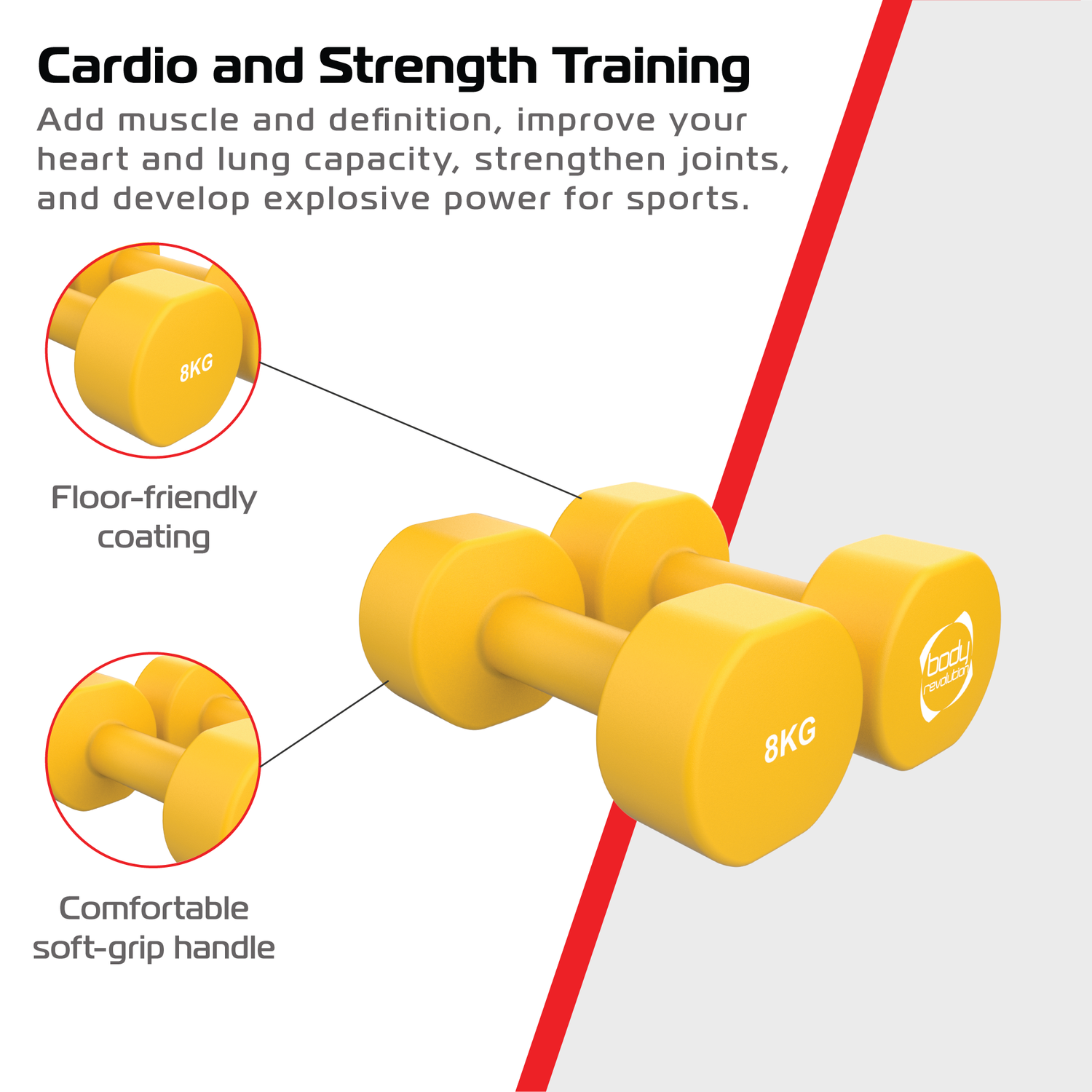 Melhore o seu treino com este par de halteres de neoprene de 8 kg. Ideal para treinos em casa ou no ginásio, adapta-se a exercícios de força ligeira e resistência aeróbica. Compactos e duráveis, são adequados para iniciantes ou atletas experientes.