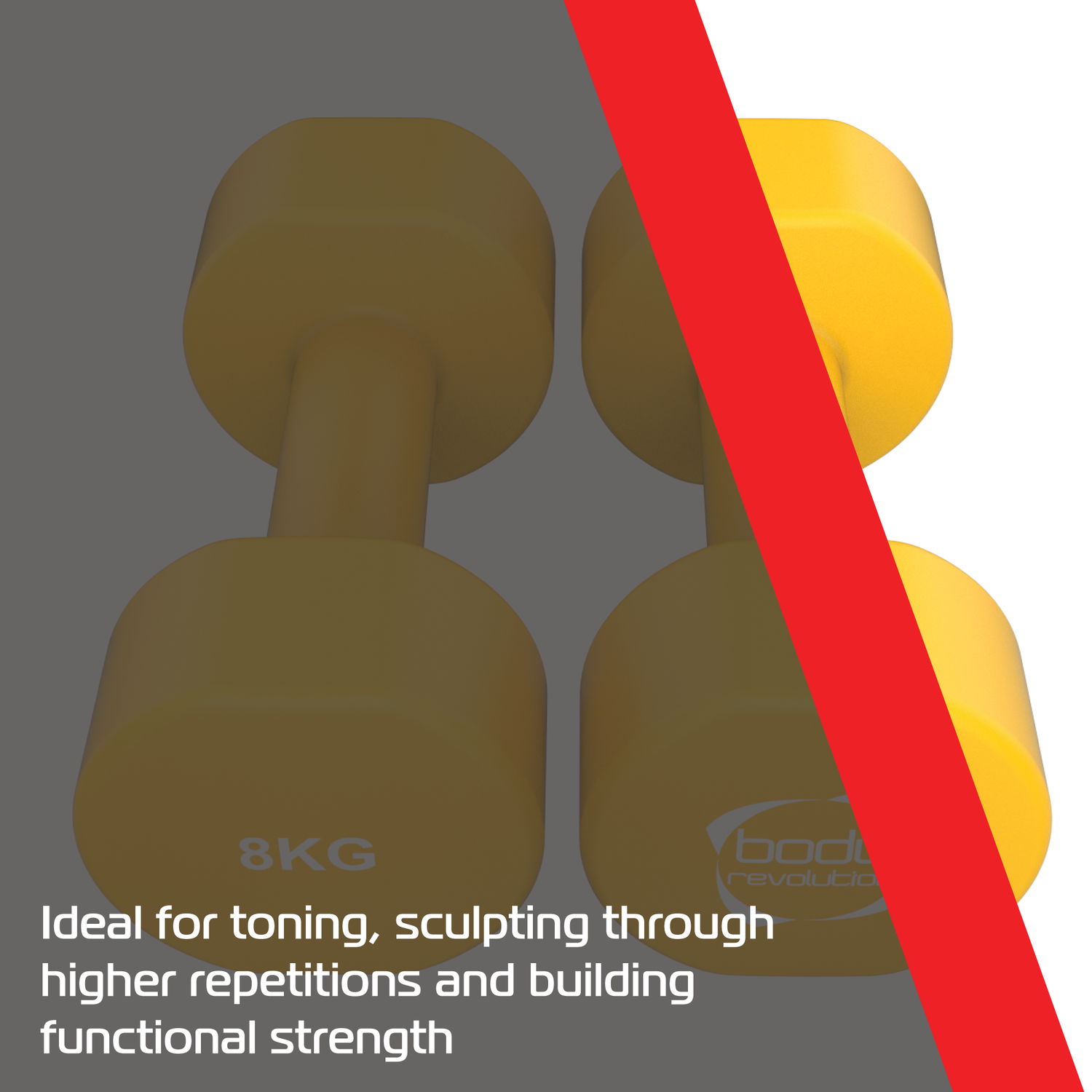 Perfeitos para usar em casa, ao ar livre ou no ginásio. Estes halteres refletem a qualidade e missão da Body Revolution.