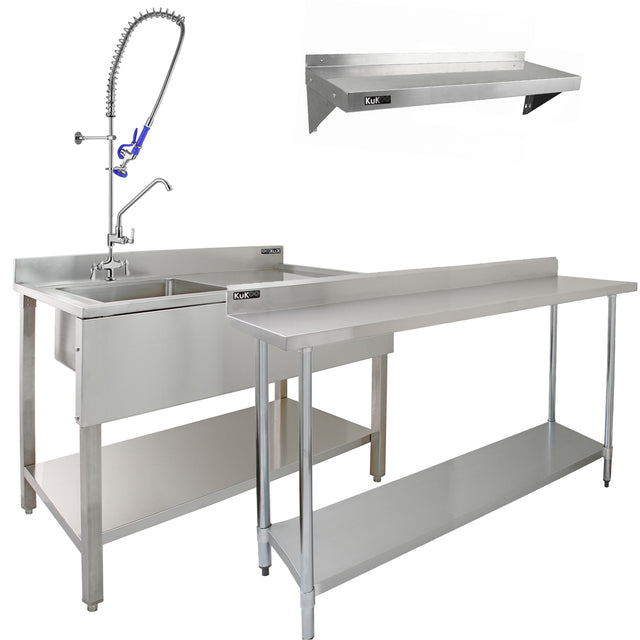 Inicie a sua cozinha profissional ou expanda o seu negócio já em pleno funcionamento com este conjunto completo KuKoo, que inclui um lava-louça comercial com torneira de pré-enxaguamento, uma mesa de trabalho de catering, duas prateleiras de parede e ainda uma torneira de pré-enxaguamento adicional – tudo o que precisa para equipar uma cozinha de sucesso!
