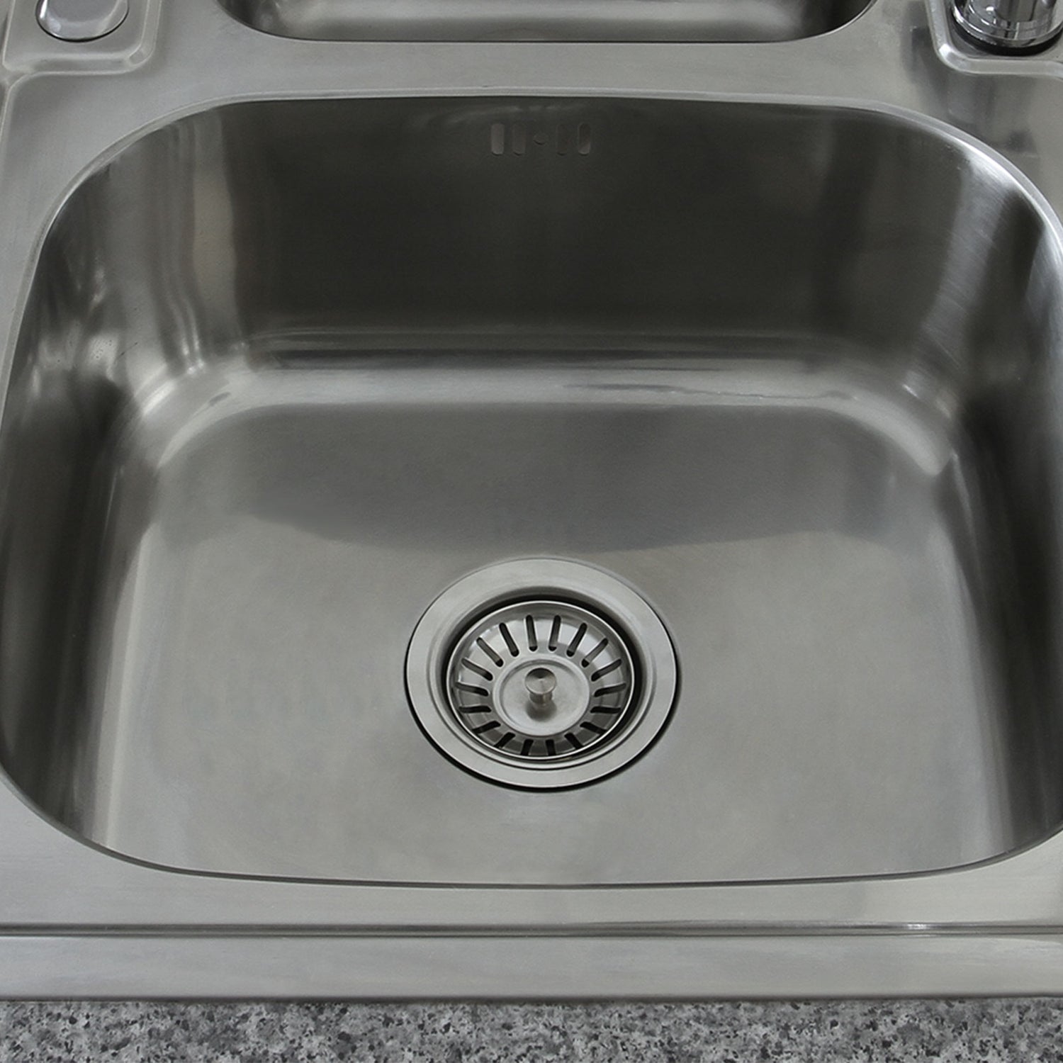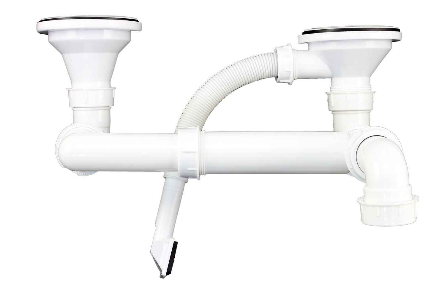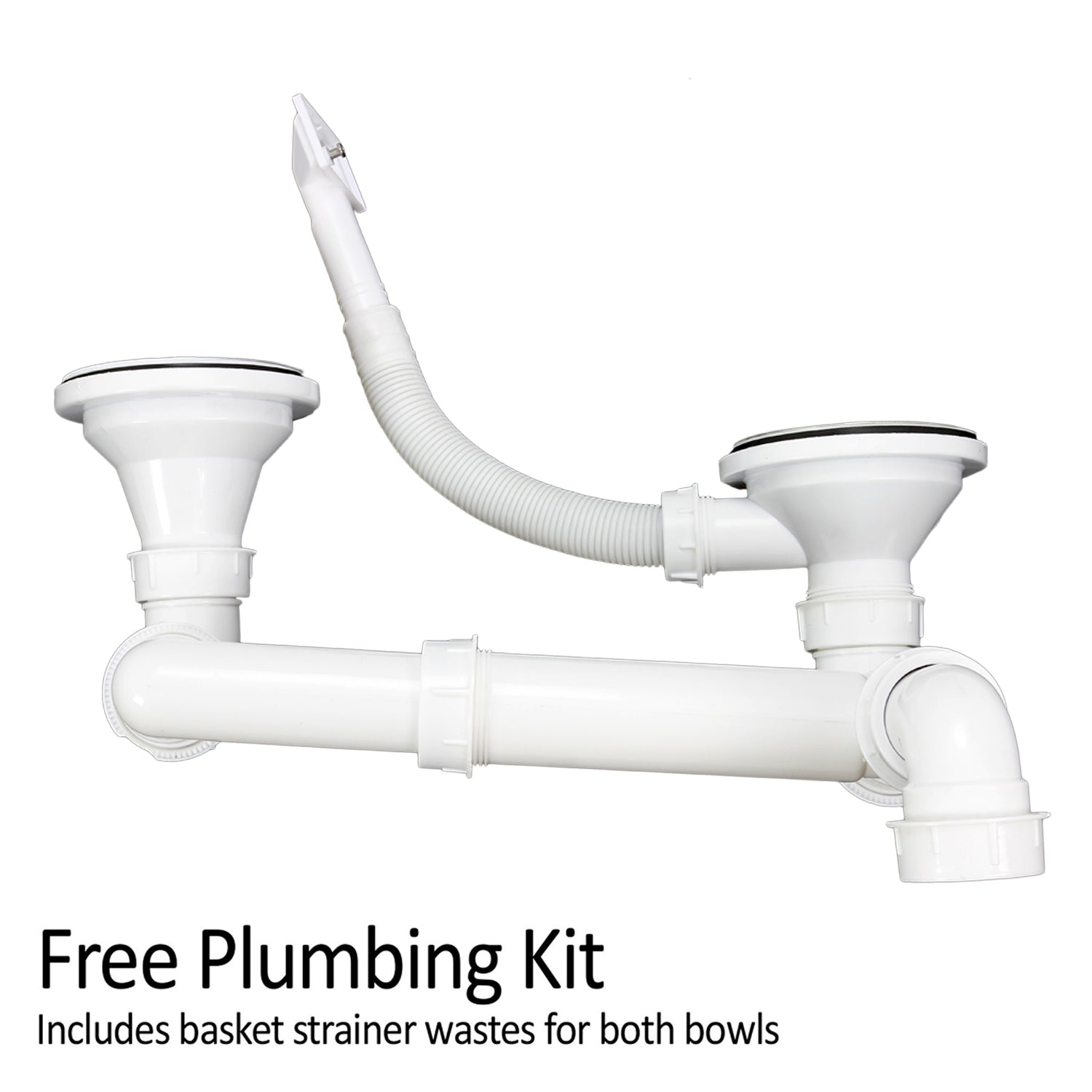 O conjunto inclui um kit de escoamento com filtro sem tampão, compatível com ambos os ralos — basta pressionar para selar e puxar para libertar a água, evitando que restos de alimentos obstruam o lava-loiça. Além disso, recebe vários acessórios sem custos adicionais, incluindo kit de canalização, tampa para o furo da torneira, grampos de fixação, tiras de vedação em borracha e a elegante torneira misturadora Rainbow.